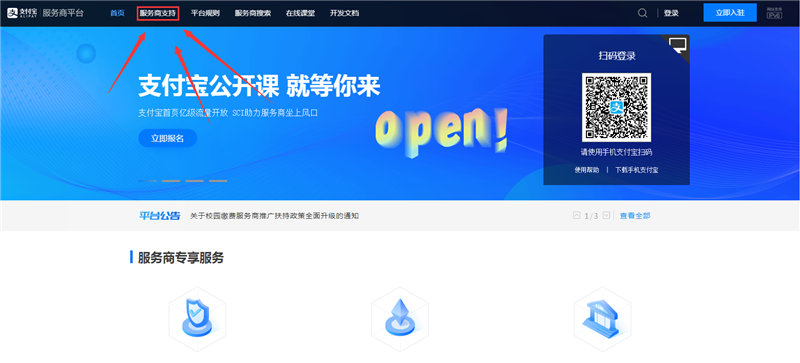 登陸支付寶官方服務商后臺,然后點擊網(wǎng)頁上方的服務商搜索,即可進入支付寶服務商搜索