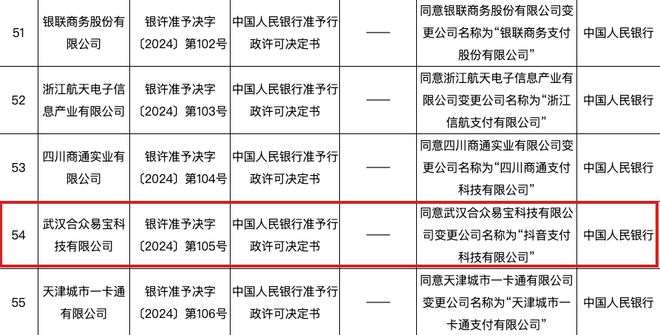 文章來源:四九八網(wǎng)絡(luò)發(fā)布時間:2024-06-21 14:10:19熱度:769中國人民銀行官網(wǎng)發(fā)布非銀行支付機(jī)構(gòu)重大事項(xiàng)變更許可信息公示(截至2024年6月)。公告顯示,中國人民銀行同意武漢合眾易寶科技有限公司(以下簡稱“合眾易寶”)變更公司名稱為“抖音支付科技有限公司”。