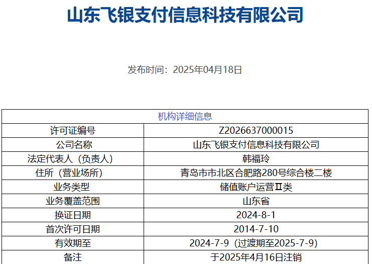 文章來源:四九八網(wǎng)絡(luò)發(fā)布時間:2025-04-25 08:59:06熱度:332近日,央行官網(wǎng)更新了已注銷許可機構(gòu)名單,又有一張支付牌照被注銷,山東飛銀支付信息科技有限公司的支付牌照被正式注銷,成為第101張被注銷的支付牌照。
