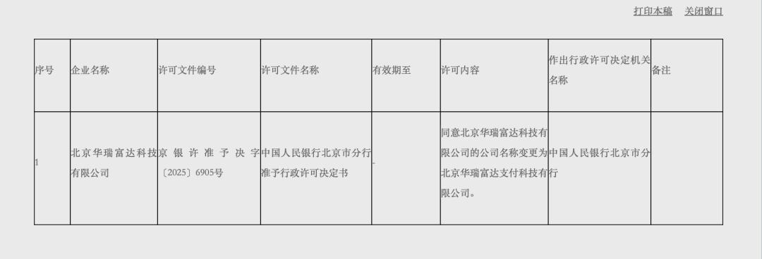 北京華瑞富達(dá)支付成立于2007年,于2012年獲得由中國人民銀行頒發(fā)的《支付業(yè)務(wù)許可證》,并于2022年6月續(xù)展成功,業(yè)務(wù)類型儲值賬戶運營Ⅱ類(預(yù)付卡發(fā)行與受理),業(yè)務(wù)范圍北京市。