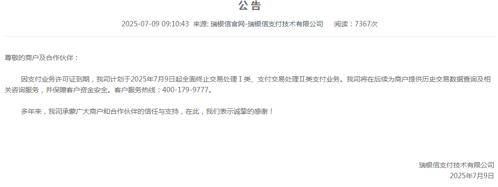 文章來源:四九八網(wǎng)絡(luò)發(fā)布時(shí)間:2025-07-17 09:24:27熱度:3307月9日,瑞銀信支付技術(shù)有限公司(下稱“瑞銀信”)發(fā)布公告,因支付業(yè)務(wù)許可證到期,我司計(jì)劃于2025年7月9日起全面終止交易處理Ⅰ類、支付交易處理Ⅱ類支付業(yè)務(wù)。我司將在后續(xù)為商戶提供歷史交易數(shù)據(jù)查詢及相關(guān)咨詢服務(wù),并保障客戶資金安全。